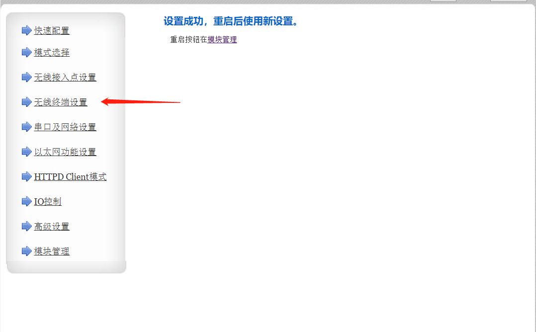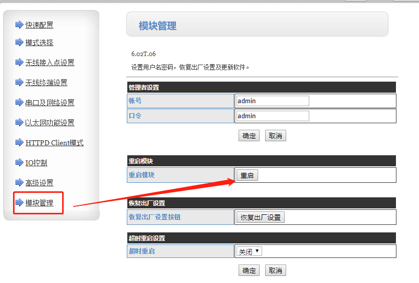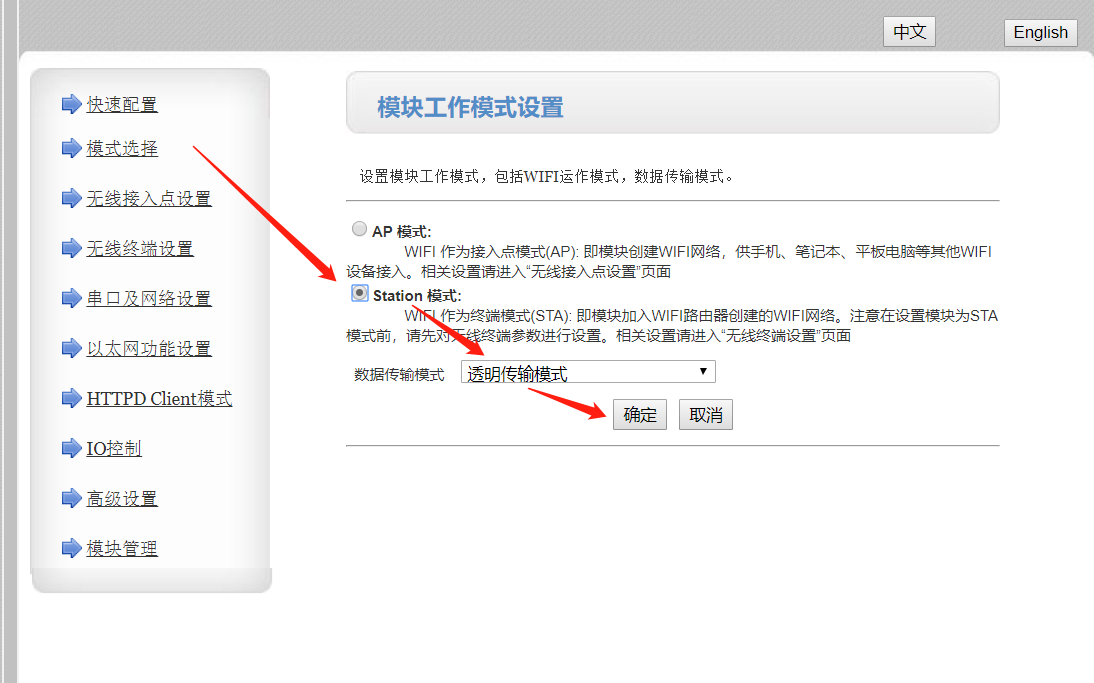 內(nèi)置網(wǎng)頁的賬號和密碼都是admin,進入以后選擇模式選擇模式選擇為sta模式,點擊確定;(先不要重啟,等設(shè)置完所有的參數(shù)再重啟設(shè)備)
