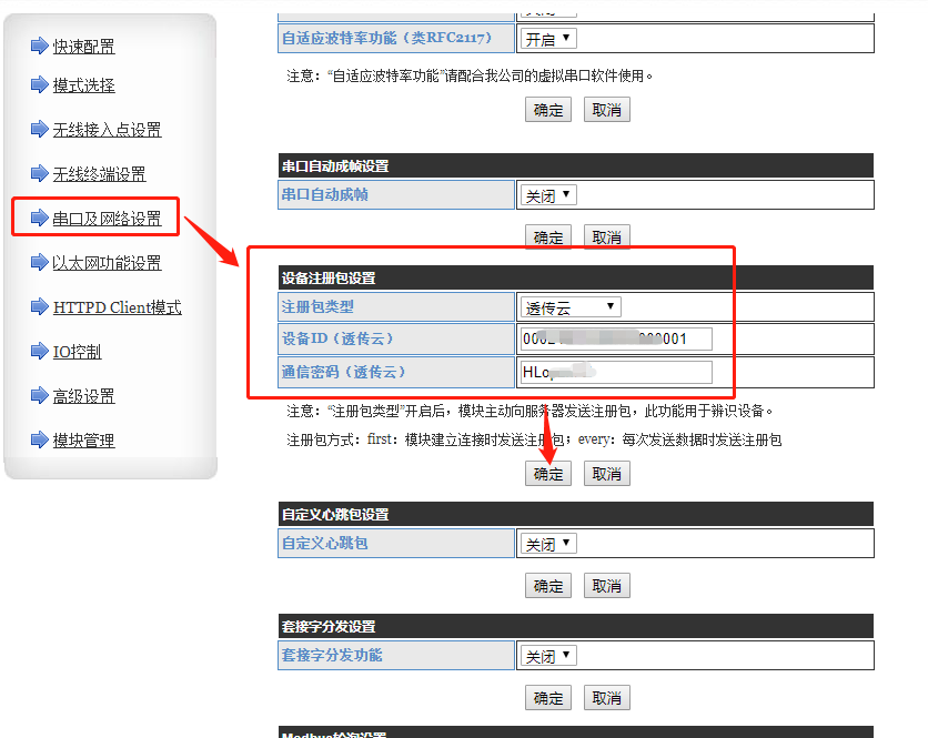 14、進入到串口及網(wǎng)絡(luò)參數(shù)設(shè)置,串口參數(shù)設(shè)置為和您終端設(shè)備的串口參數(shù)一致。注冊包選擇透傳云,填上透傳云上新建立的設(shè)備id,和密碼(如下圖所示),點擊保存