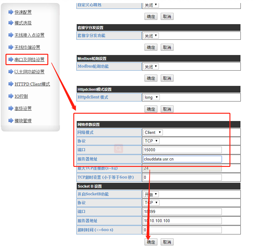 15、在串口及網(wǎng)絡(luò)參數(shù)中的網(wǎng)絡(luò)設(shè)置上設(shè)置為Tcp Client,透傳云的域名為clouddata.usr.cn,透傳云的端口為15000,設(shè)置完點擊保存;