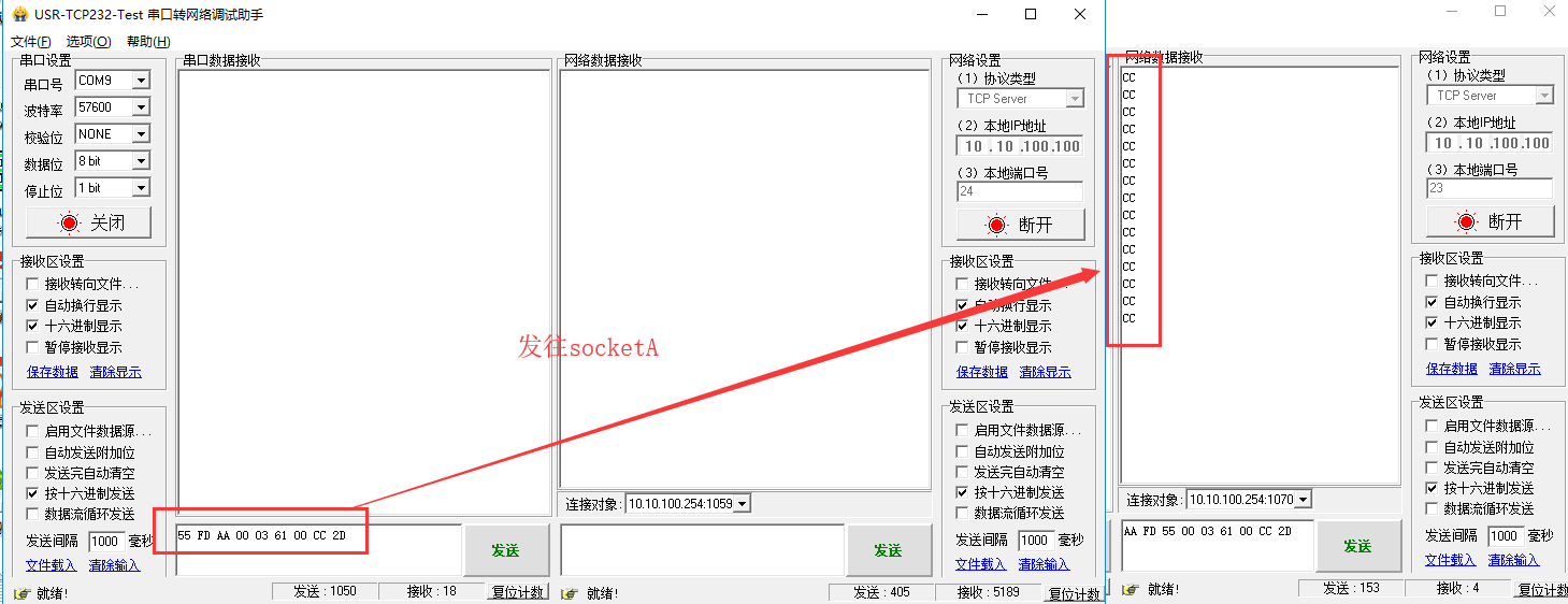 SocketA和B都重新斷開,重新連接,都可以給串口端發(fā)送數(shù)據(jù)!如圖所示