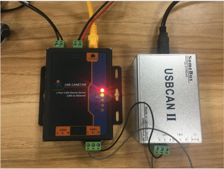 將USR-CANET200接上標(biāo)準(zhǔn)的電源適配器(端子供電),通過(guò)網(wǎng)線直連的方式,連接到電腦,將can轉(zhuǎn)usb的can1接到cannet200的can1口上,usb口接電腦usb口,485轉(zhuǎn)usb一端接can的485口,一端接電腦usb口。