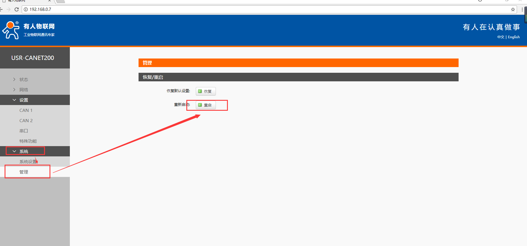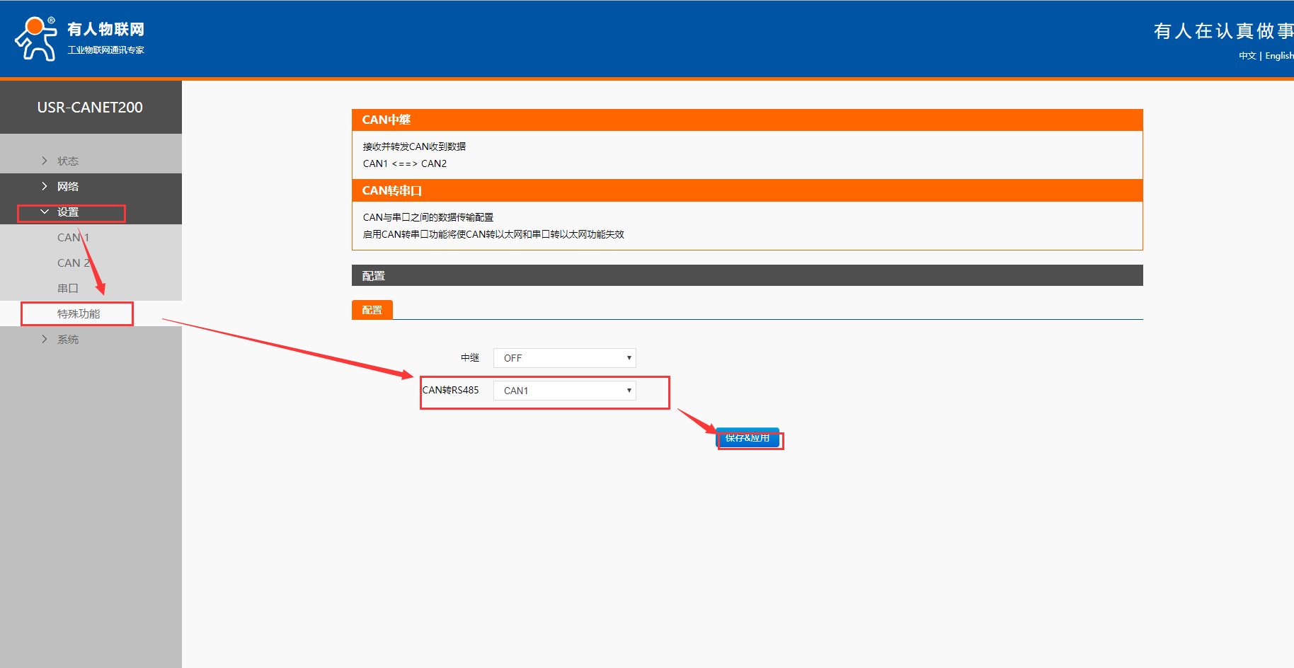 2. 瀏覽器輸入地址192.168.0.7,進(jìn)入canet200的內(nèi)質(zhì)網(wǎng)頁(yè),選擇設(shè)置->特殊功能->can轉(zhuǎn)485->打開can1,如圖所示,然后重啟。