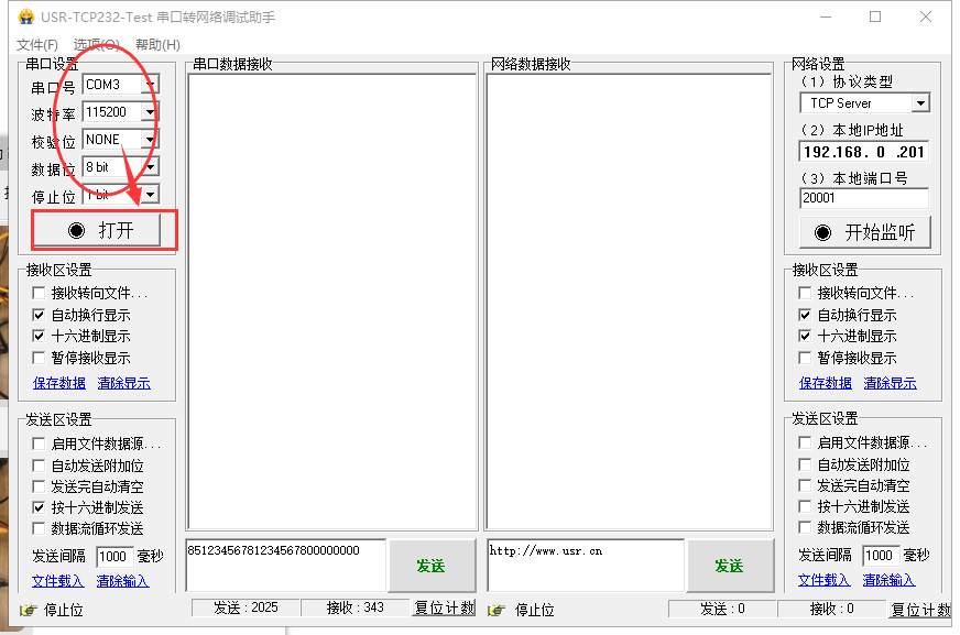 4. 打開USR-TCP232-test串口轉(zhuǎn)網(wǎng)絡(luò)調(diào)試助手,左側(cè)選擇已連接的com口,波特率為115200,校驗(yàn)位none,數(shù)據(jù)位8bit,停止位1bit,單擊打開。