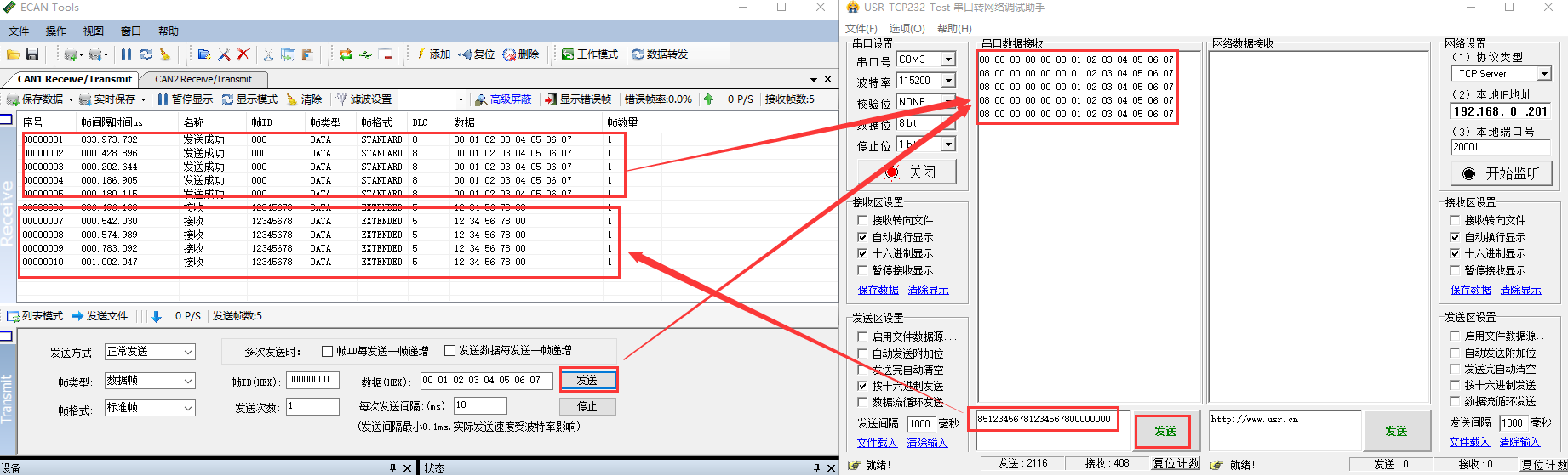 5. CAN協(xié)議數(shù)據(jù):85123456781234567800000000、05000006781234567800000000,日?qǐng)D所示,實(shí)現(xiàn)485轉(zhuǎn)can的通信。