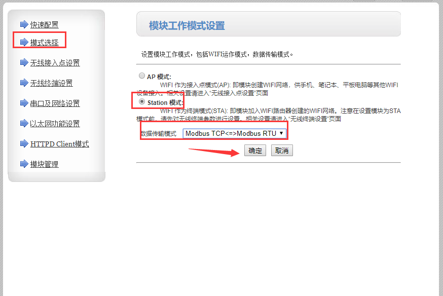 4、模式選擇: STA,modbus rtu<=>modbus tcp協(xié)議轉(zhuǎn)換。 注:確定后,不用立刻重啟,等著全部修改完成一塊重啟。