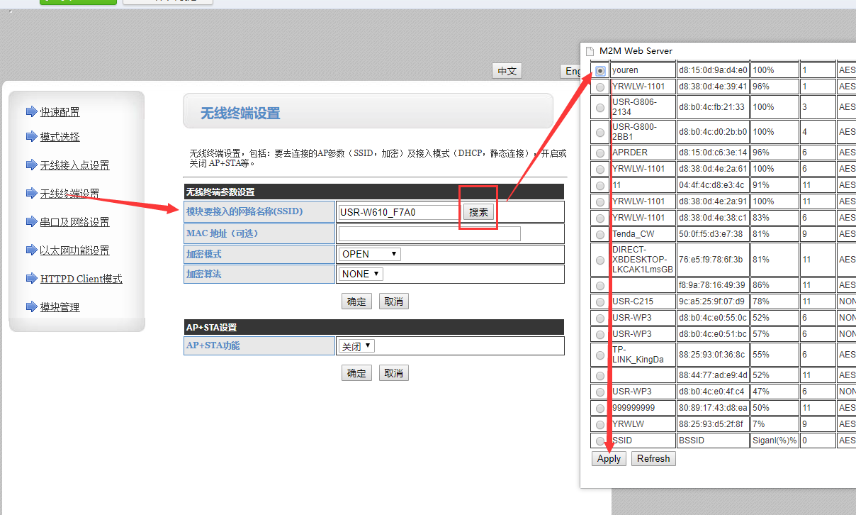 (1)點(diǎn)擊無線終端設(shè)置,點(diǎn)擊搜索,搜索路由器,選擇要連接的路由器,點(diǎn)擊確定;