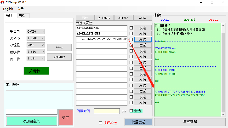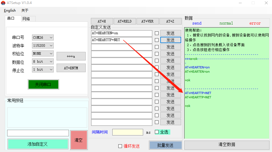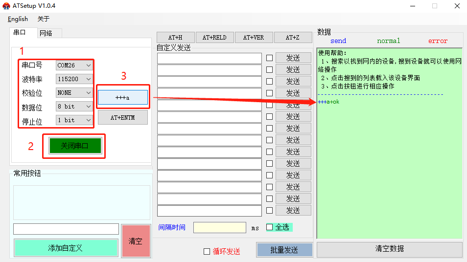 a. 模塊上電,串口連接電腦且以成功建立TCP連接。使用小紅人軟件打開串口,模塊默認(rèn)串口參數(shù)為: 波特率 115200、無校驗、8 位數(shù)據(jù)位、1 位停止位。點擊“+++a”,會返回+ok,說明已經(jīng)進(jìn)入命令行模式。