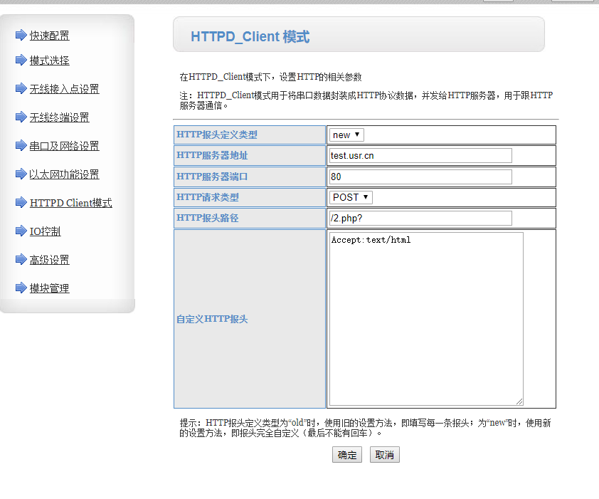 5. 在httpd client模式下選擇POST模式、test.usr.cn為我們的測試服務(wù)器,是您發(fā)送什么返回什么,設(shè)置完成后確定。
