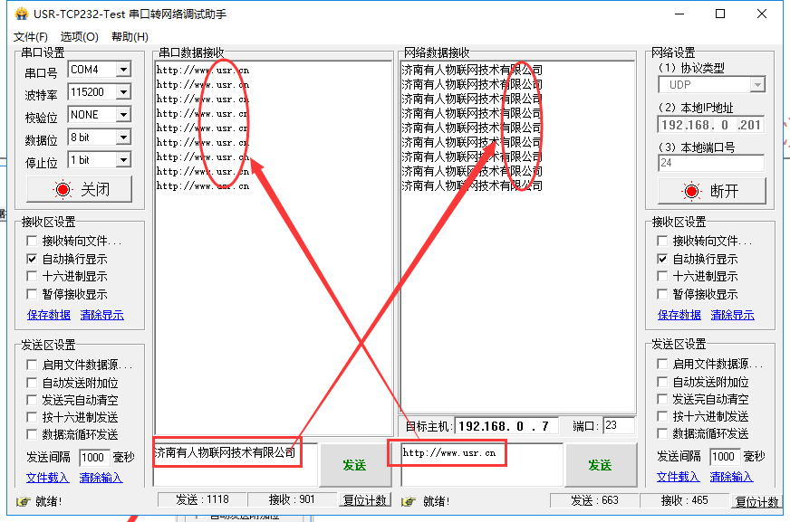 6、單擊發(fā)送,由此實(shí)現(xiàn)串口端和網(wǎng)絡(luò)端的通信。