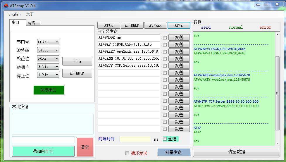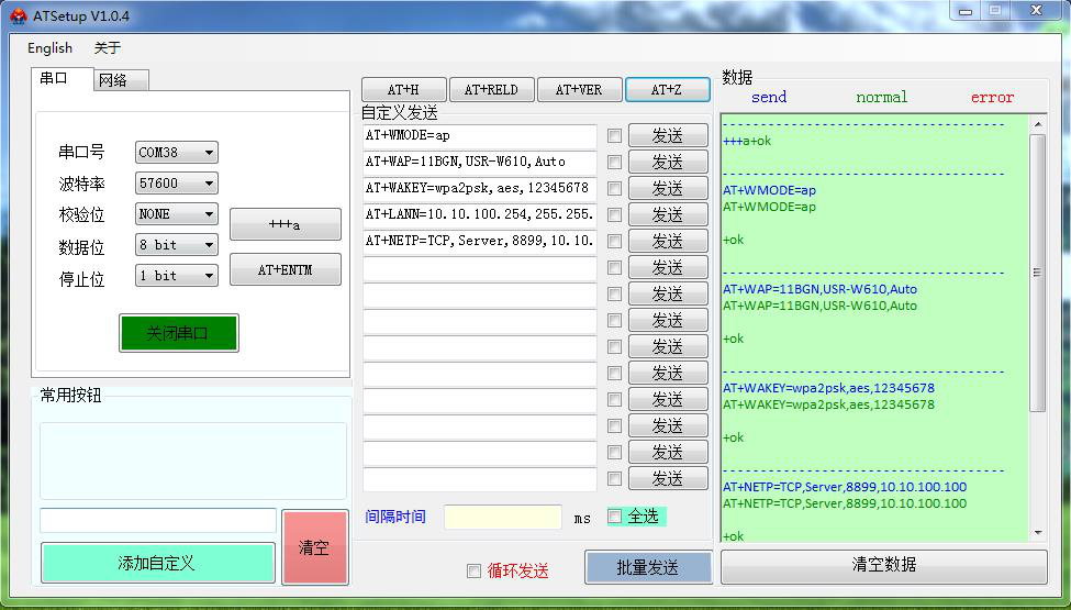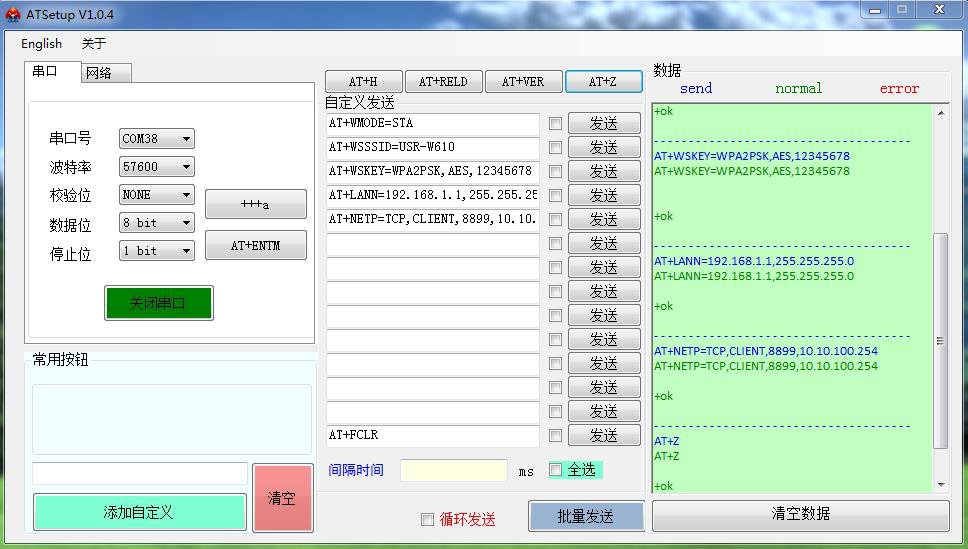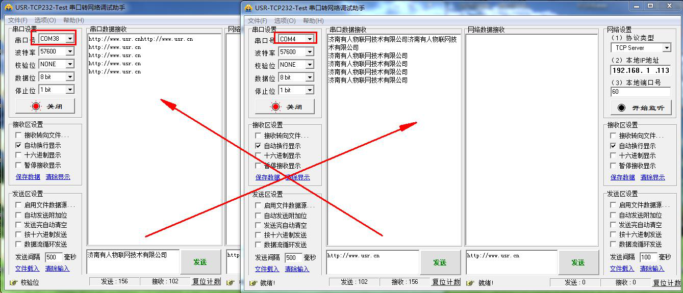 在電腦上用USR-TCP232-TEST軟件測試,分別打開對應(yīng)的兩個COM口,測試兩個串口之間相互傳輸數(shù)據(jù)。