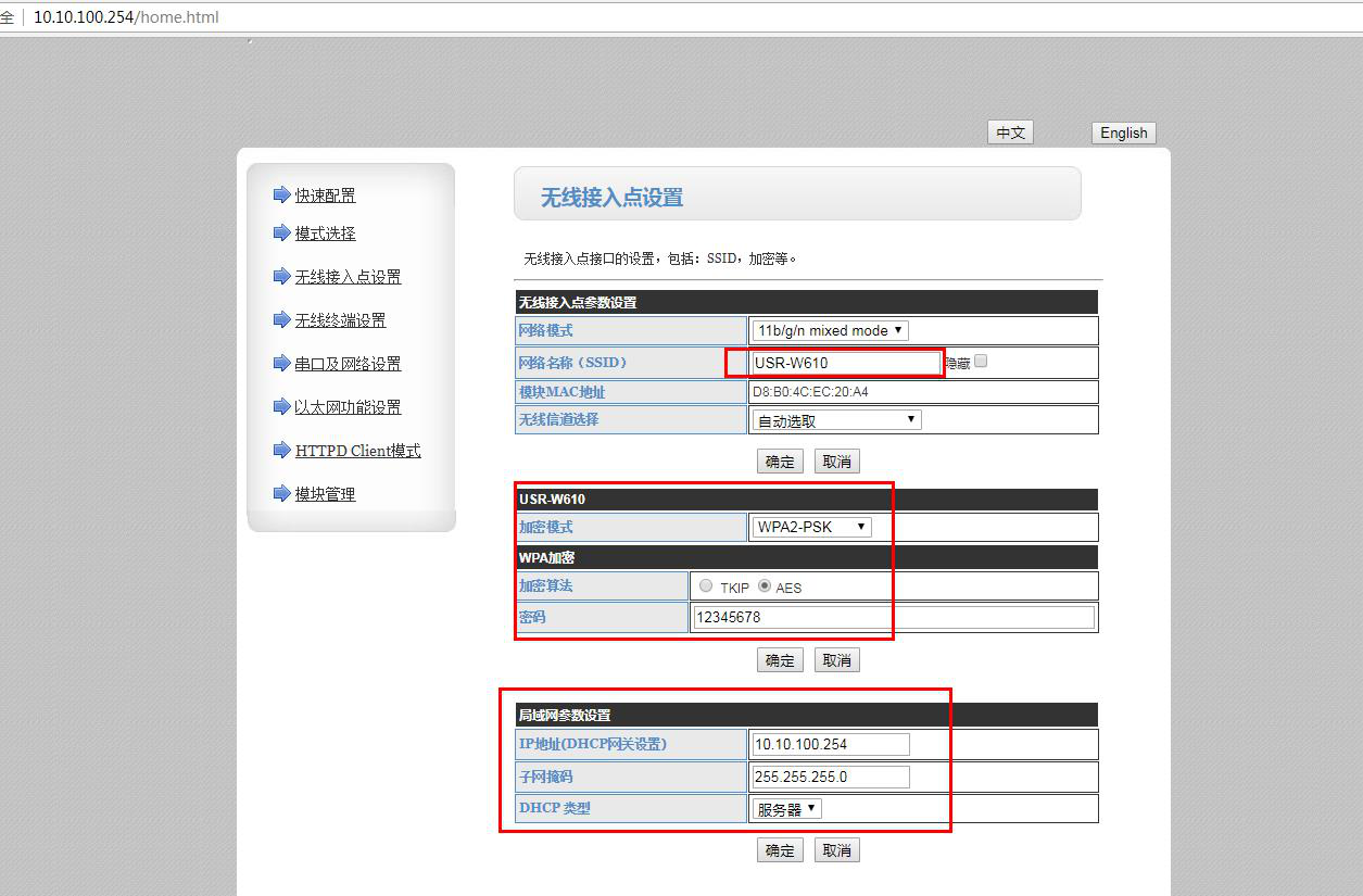 1、1號USR-W610 AP模式參數(shù)設(shè)置: