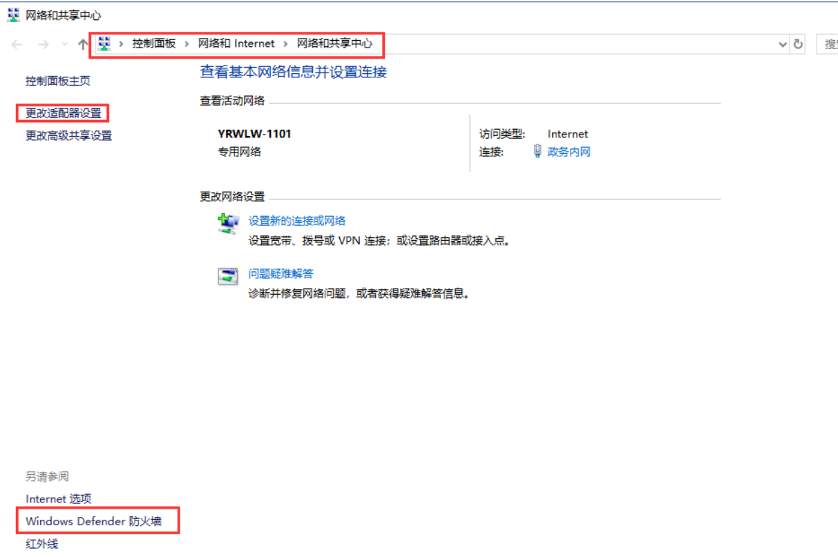 1、按路徑:控制面板===》網(wǎng)絡(luò)和Internet===》網(wǎng)絡(luò)和共享中心找到“windows防火墻”和“更改適配器設(shè)置”選項,關(guān)閉防火墻并禁用與本次測試無關(guān)的網(wǎng)卡。并關(guān)閉電腦殺毒軟件。