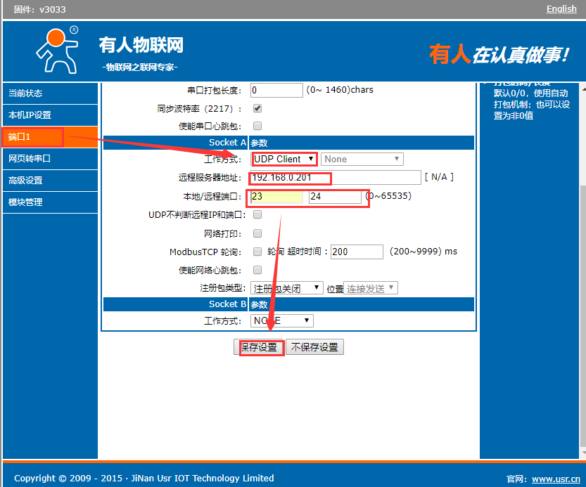 4、單擊端口1,設(shè)置socket A參數(shù),工作方式選擇UDP Client,遠(yuǎn)程地址填192.168.0.201,本地端口填23、遠(yuǎn)程端口24保存設(shè)置,重啟。
