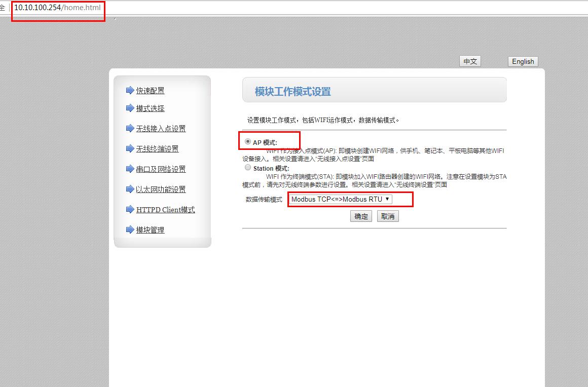 網(wǎng)頁上設置AP模式,開啟MODBUS TCP轉(zhuǎn)MODBUS RTU模式。串口及網(wǎng)絡設置,設置串口參數(shù)。MODBUS輪詢設置開啟,時間設置5000ms。網(wǎng)絡模式設置TCP server,端口8899.