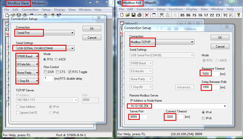 打開MODBUS POLL軟件,設置MODBUS TCP,IP填DR404的IP 10.10.100.254,服務器的端口填8899。配置好3個時間參數(shù)。