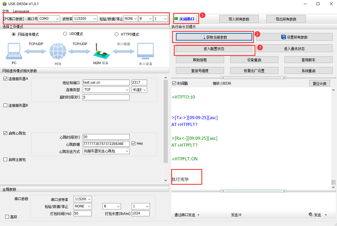 4. 打開串口后,先點(diǎn)擊進(jìn)入配置狀態(tài),如果模塊能返回+ok的字符,說明電腦和模塊連接是沒有問題的;然后點(diǎn)擊進(jìn)入通訊狀態(tài)如圖,做數(shù)據(jù)通訊測(cè)試。如果不返回+OK的話,請(qǐng)參考(步驟3)