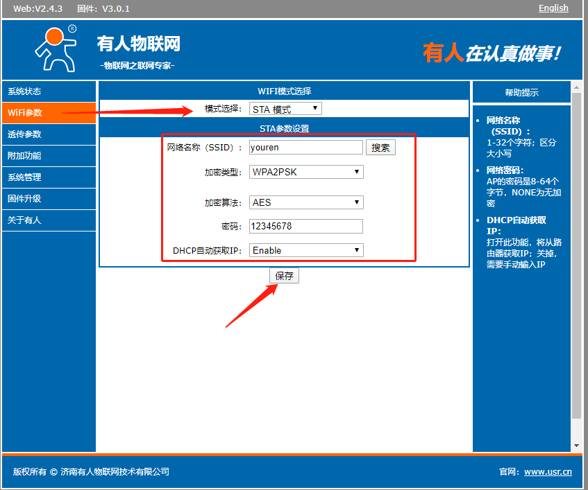13、進入到“透傳參數(shù)”,串口參數(shù)設置為和您終端設備的串口參數(shù)一致。網(wǎng)絡設置上設置為Tcp Client,透傳云的域名為clouddata.usr.cn,透傳云的端口為15000,設置完點擊保存;