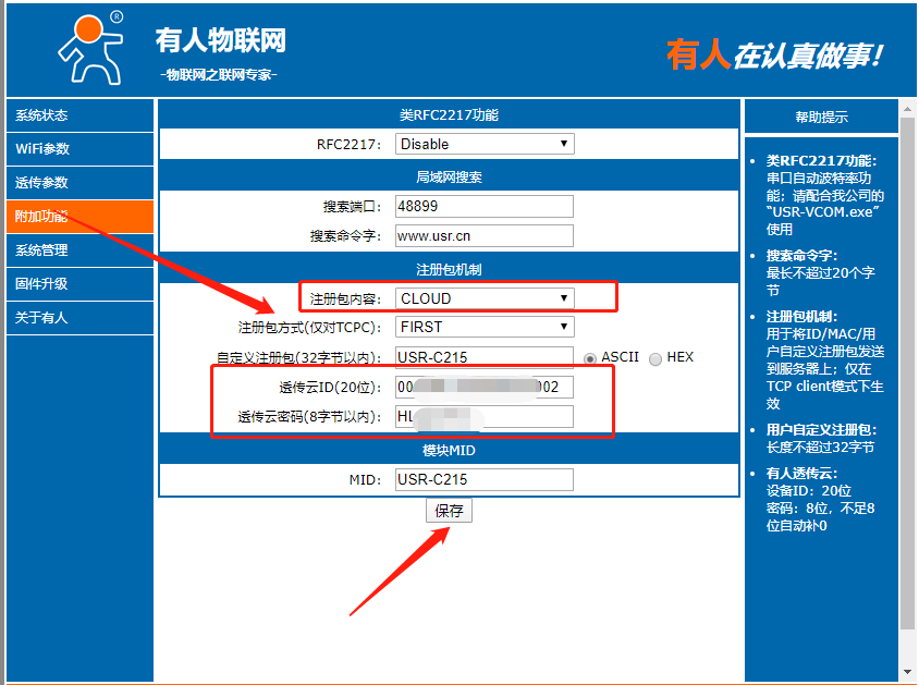 14、進入附加功能,注冊包選擇透傳云,填上透傳云上新建立的設備id,和密碼(如下圖所示),點擊保存