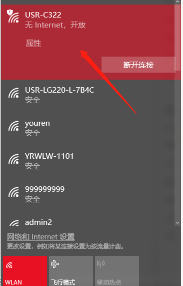 (1) 將模塊焊接到測試底板上,測試板串口連接電腦串口,電腦連接WiFi。在電腦無線搜索欄,搜索USR-C322,連接。
