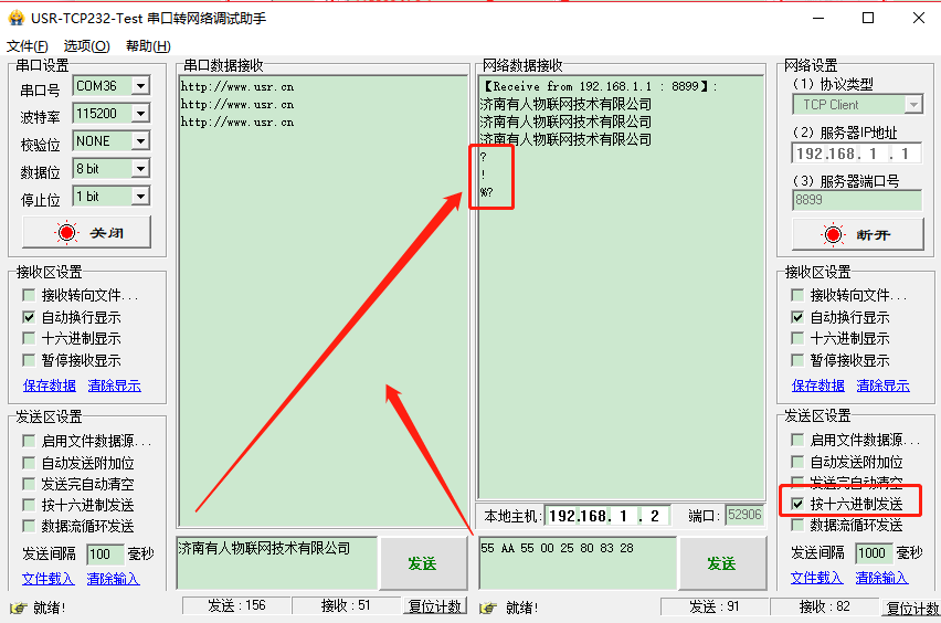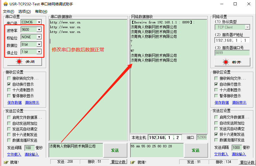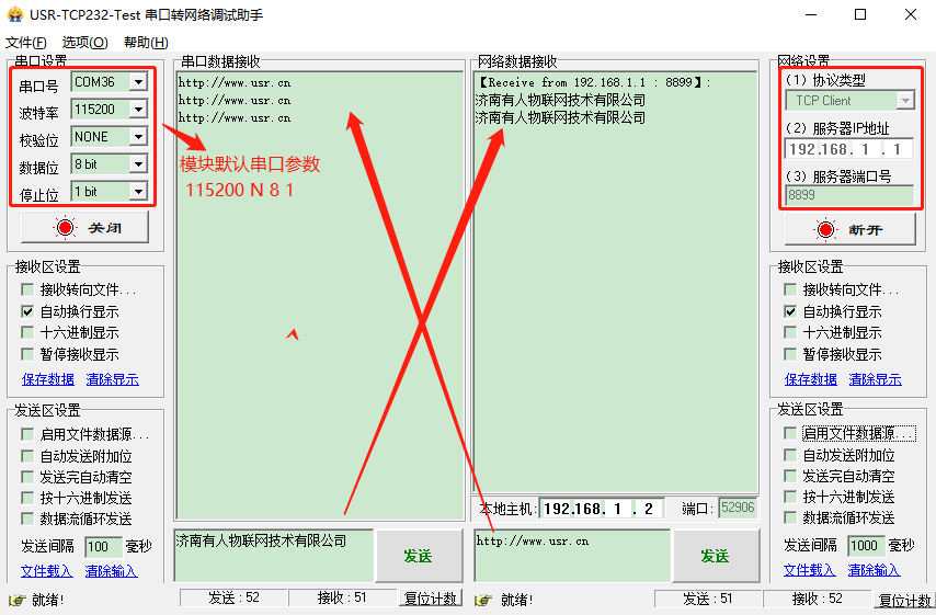 (3) 打開USR-TCP232-TEST軟件測試