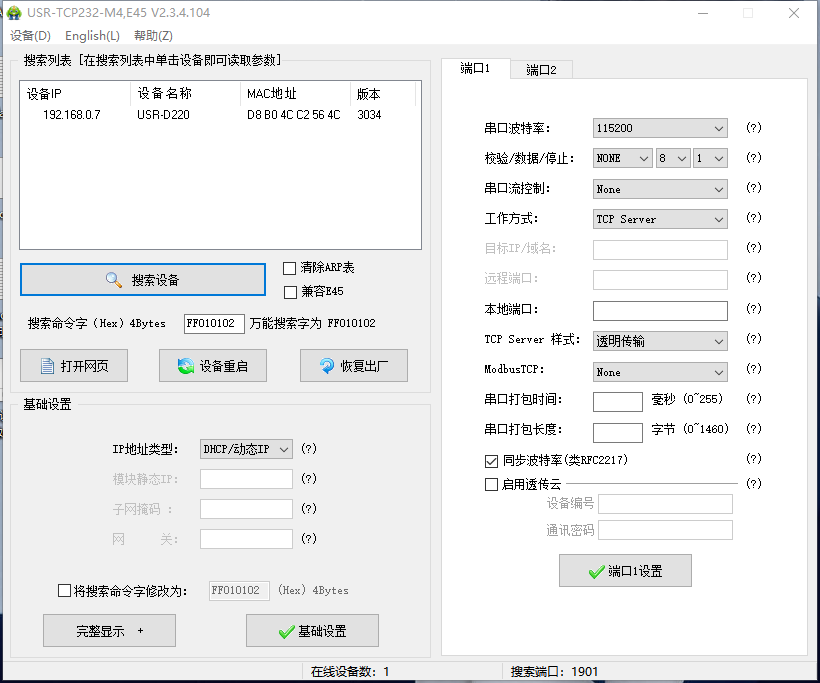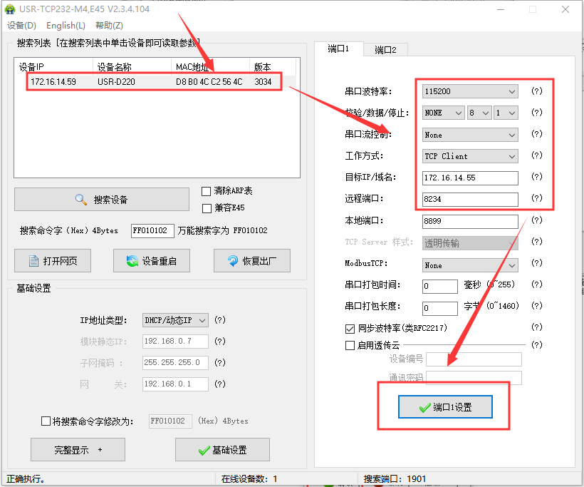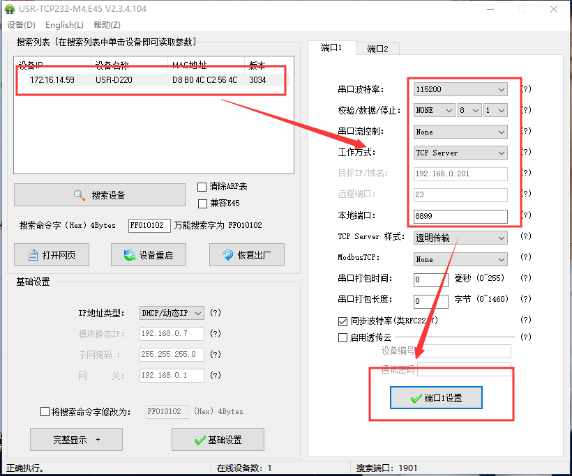點(diǎn)擊“搜索設(shè)備”,當(dāng)搜索列表中出現(xiàn)520的設(shè)備后,單擊搜索到的設(shè)備,設(shè)置配置信息并保存(動(dòng)態(tài)IP)