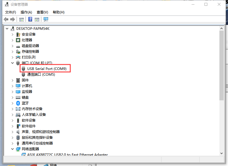 在設(shè)備管理器中查看端口信息,確定520串口使用的串口號(hào),如下圖所示電腦端口號(hào)為COM9
