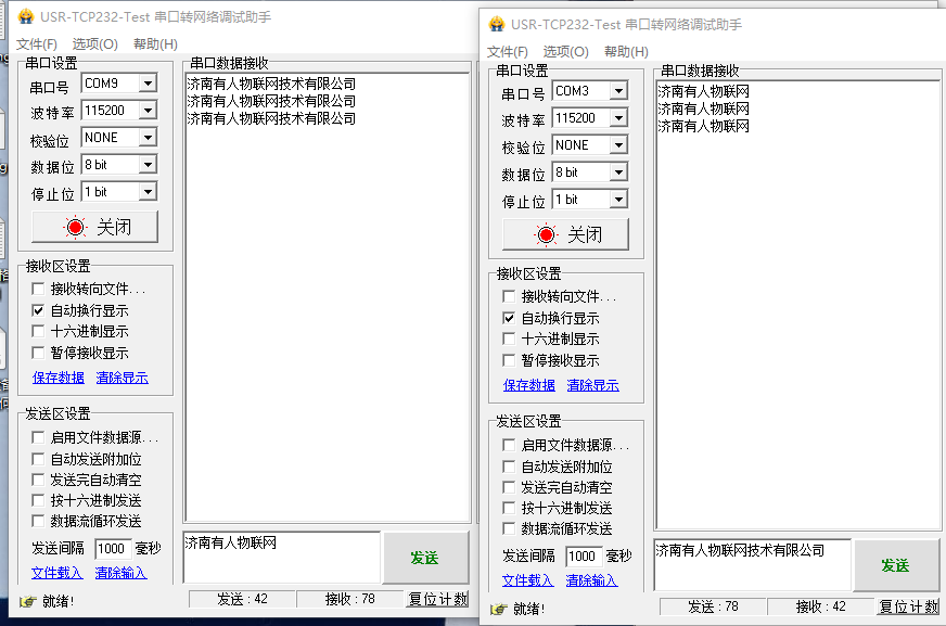 同時(shí)打開兩個(gè)串口轉(zhuǎn)網(wǎng)絡(luò)助手軟件。一個(gè)選擇虛擬串口,一個(gè)選擇COM9,即可進(jìn)行收發(fā)測(cè)試