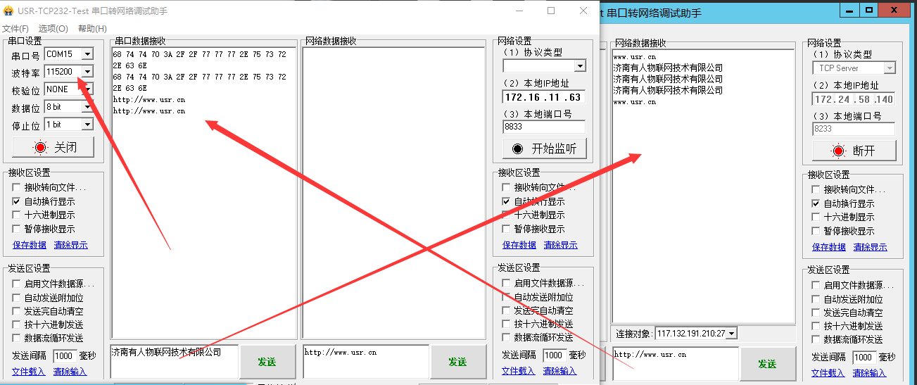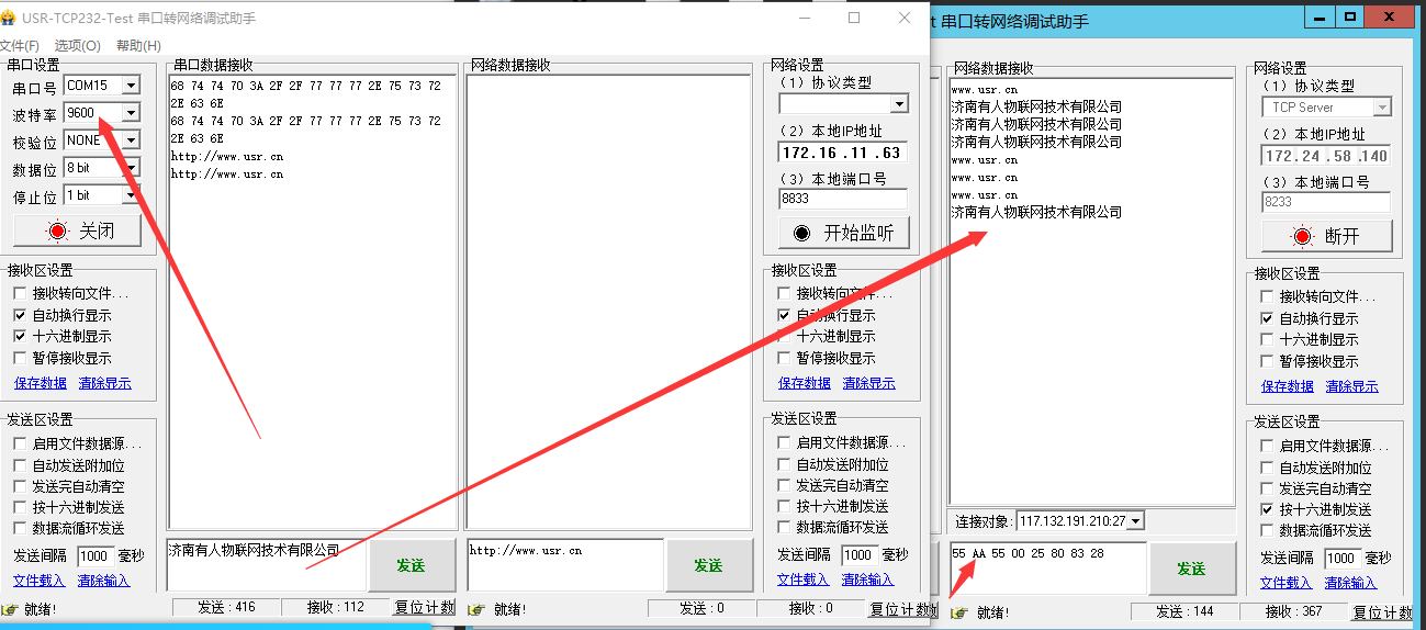 4.根據(jù)類 RFC2217 協(xié)議更改波特率,從網(wǎng)絡(luò)端動(dòng)態(tài)修改串口參數(shù),關(guān)閉串口,波特率更改為9600,打開串口發(fā)送數(shù)據(jù)如圖4.1、4.2(這種修改只是臨時(shí)性的,模塊重啟后,恢復(fù)原來(lái)的參數(shù))