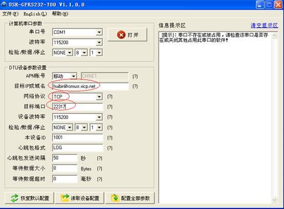 設(shè)置目標(biāo)IP及端口如下,第一個是USR-TCP232-E45以太網(wǎng)轉(zhuǎn)串口模塊,第二個是GPRS232-700,