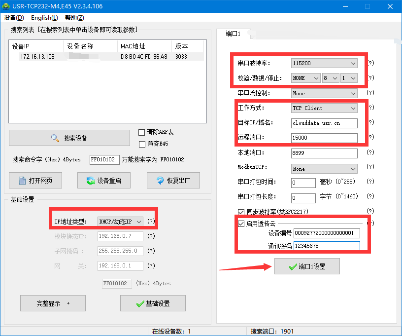 4、設(shè)置參數(shù):將工作方式 ,遠(yuǎn)程服務(wù)器地址和遠(yuǎn)程端口分別設(shè)置為:TCp client、clouddata.usr.cn、15000