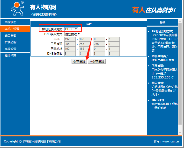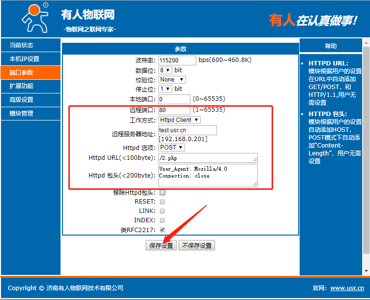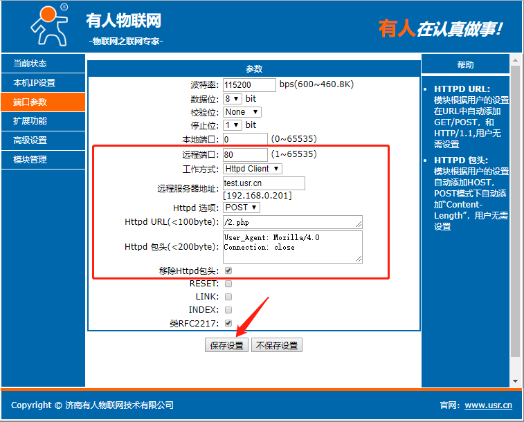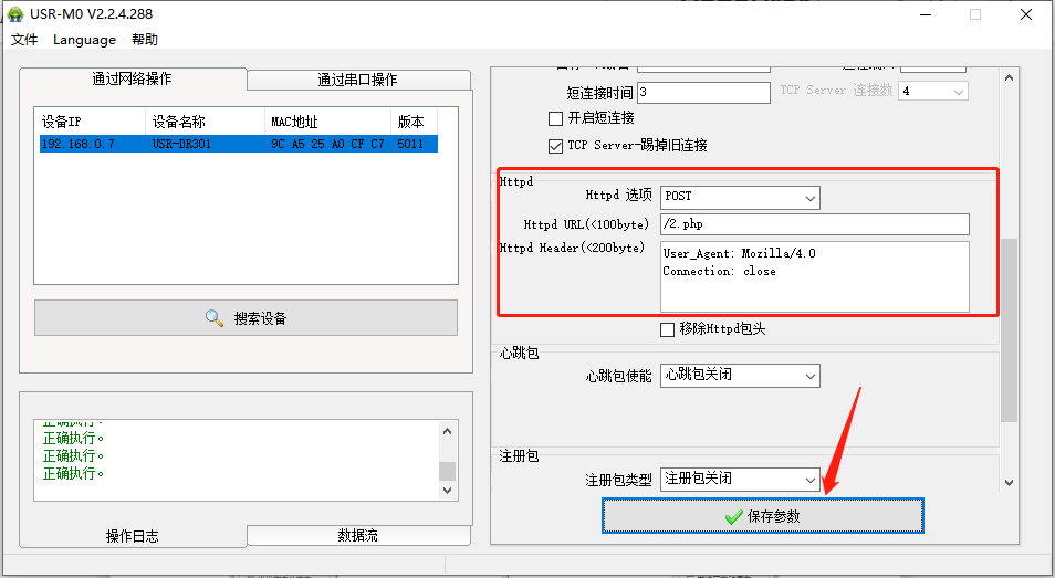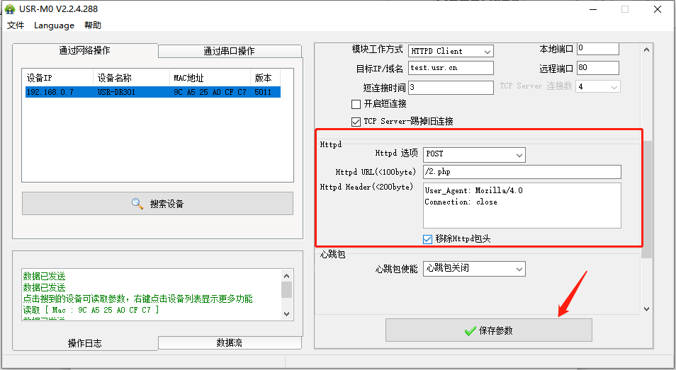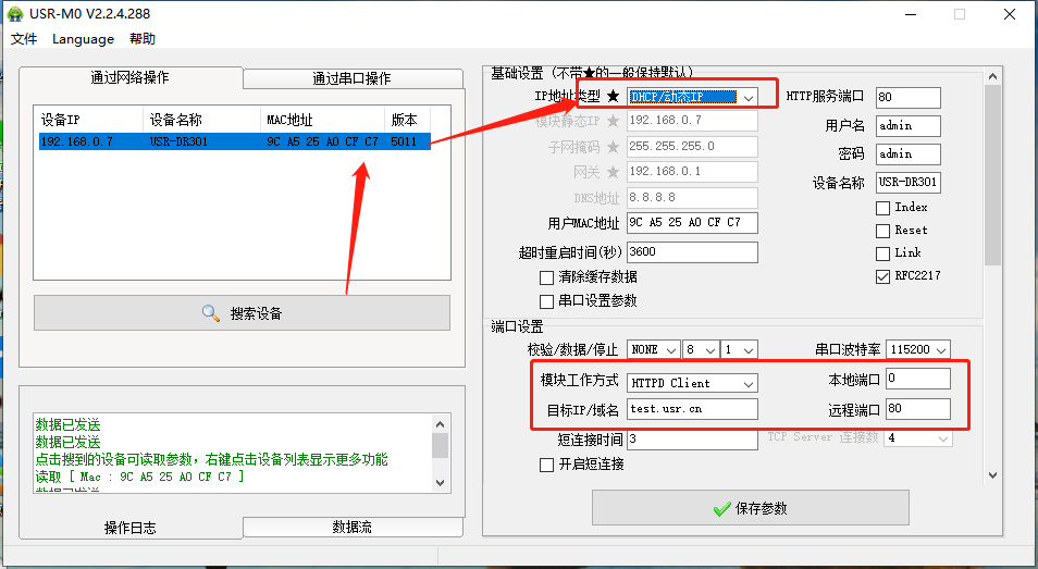 點(diǎn)擊“搜索設(shè)備”當(dāng)搜索列表中出現(xiàn)301的設(shè)備后,單擊搜索到的設(shè)備,IP設(shè)置為DHCP,模塊設(shè)置為Httpd Client模式,請(qǐng)求方式POST,URL為/2.php,設(shè)置服務(wù)器地址test.usr.cn,端口80,設(shè)置并保存所有參數(shù),重啟模塊。(本說(shuō)明文檔使用為有人測(cè)試服務(wù)器)