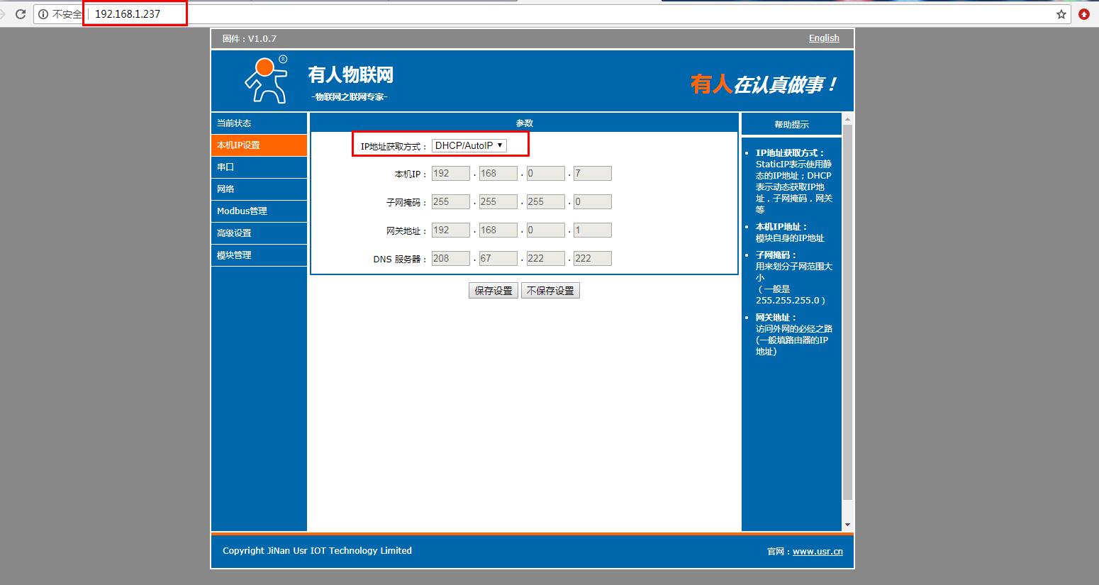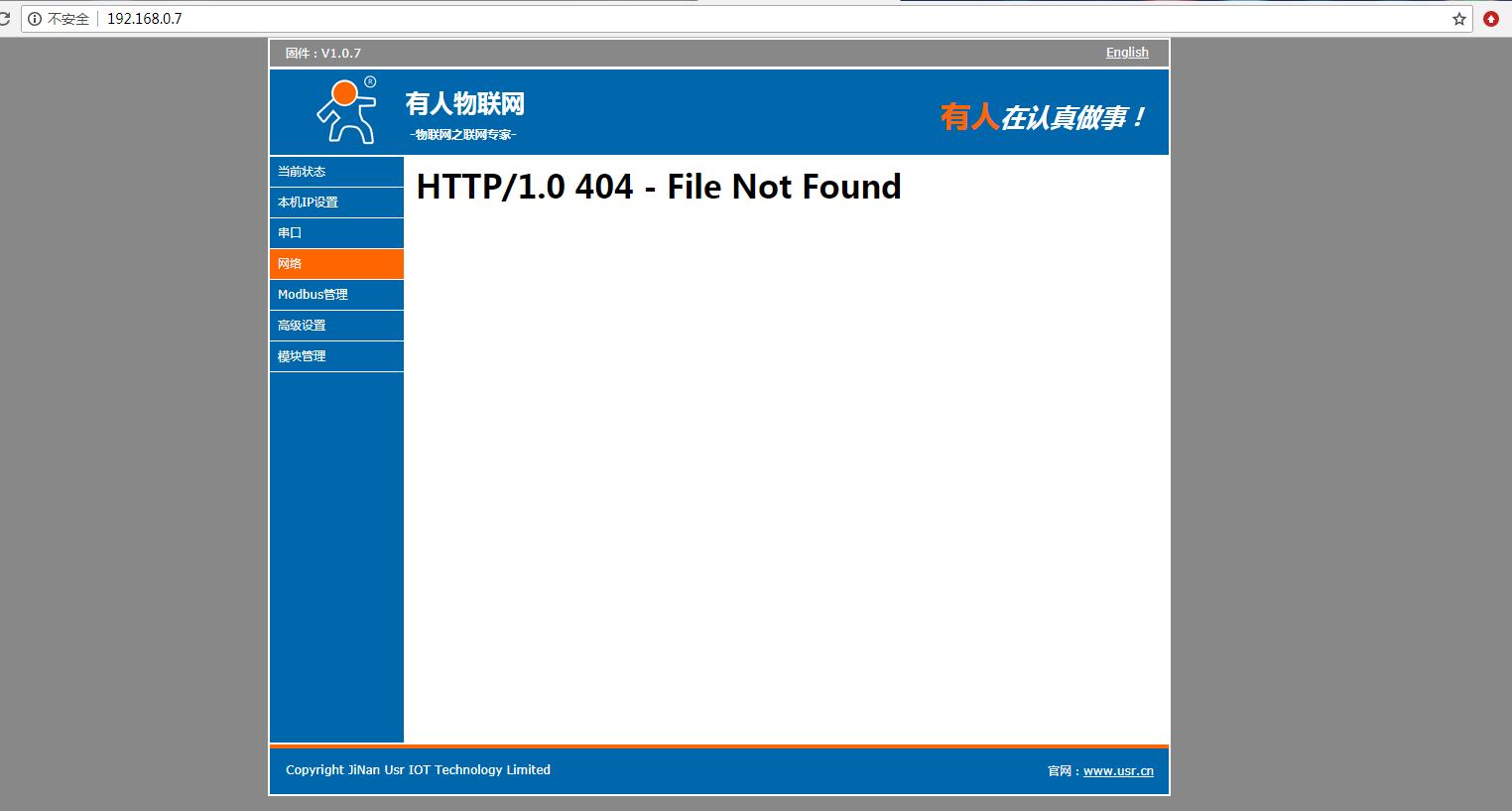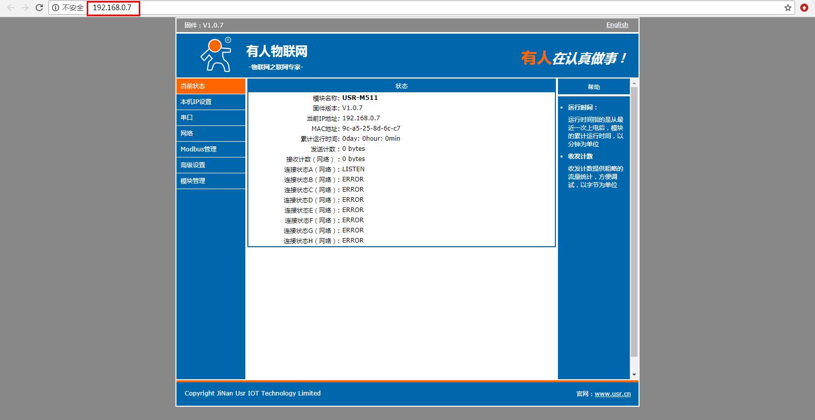 在電腦打開(kāi)瀏覽器,輸入靜態(tài)IP192.168.0.7 登錄USR-M511的內(nèi)置網(wǎng)頁(yè)。