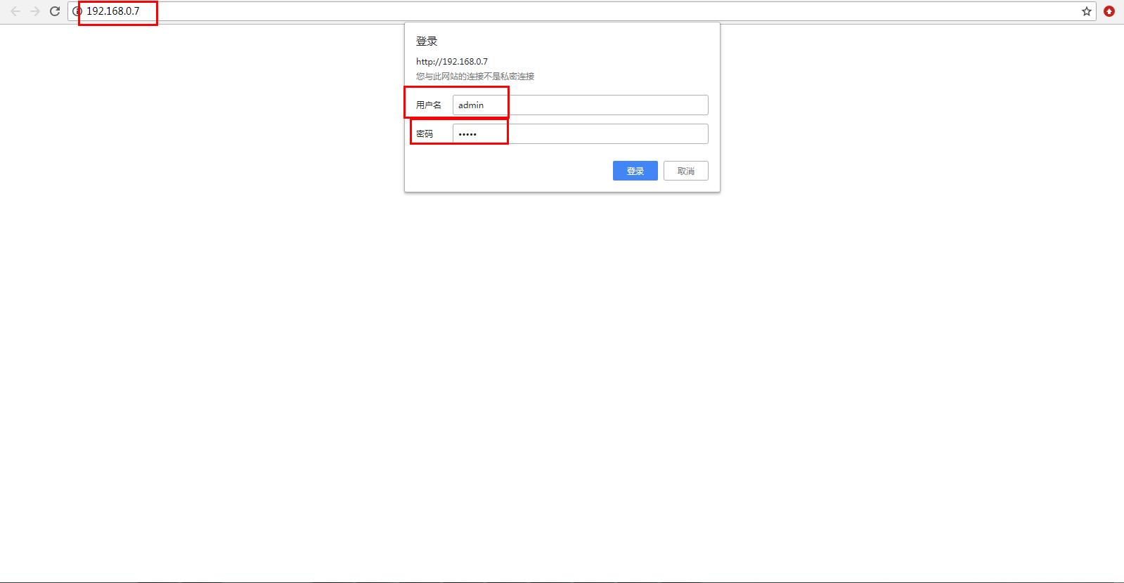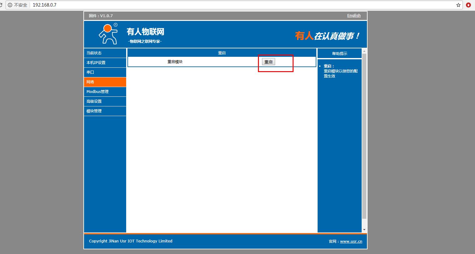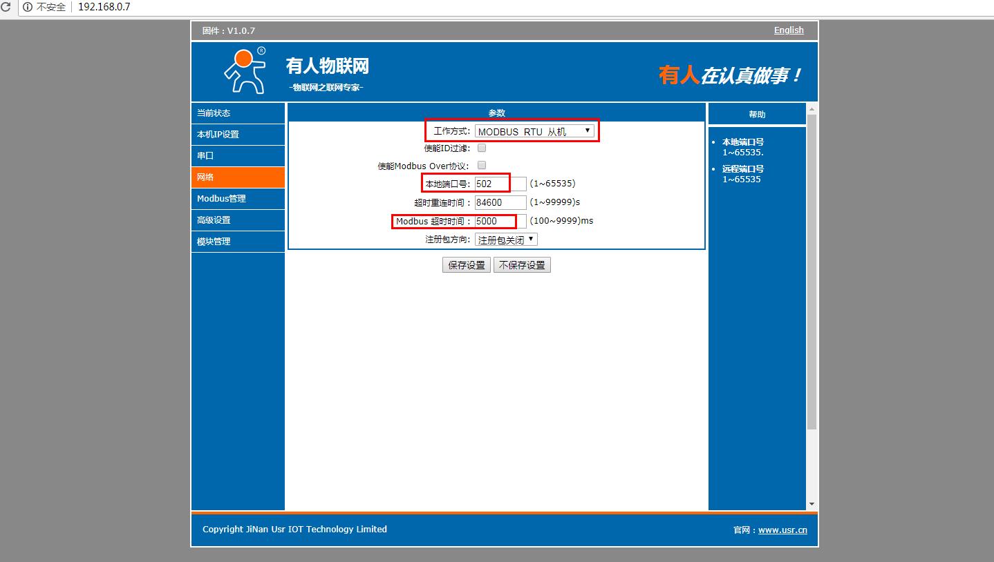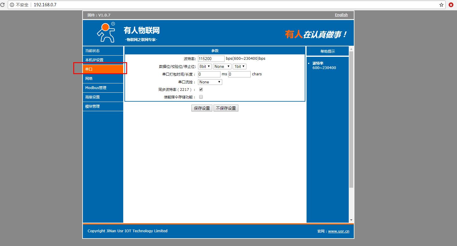 在電腦打開(kāi)瀏覽器,輸入靜態(tài)IP192.168.0.7 登錄USR-M511的內(nèi)置網(wǎng)頁(yè)。