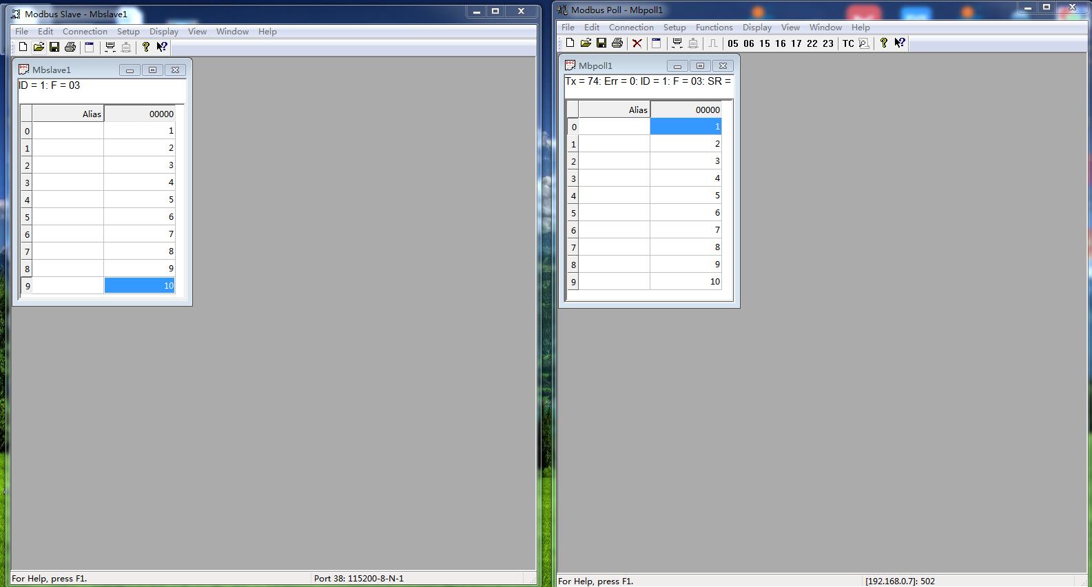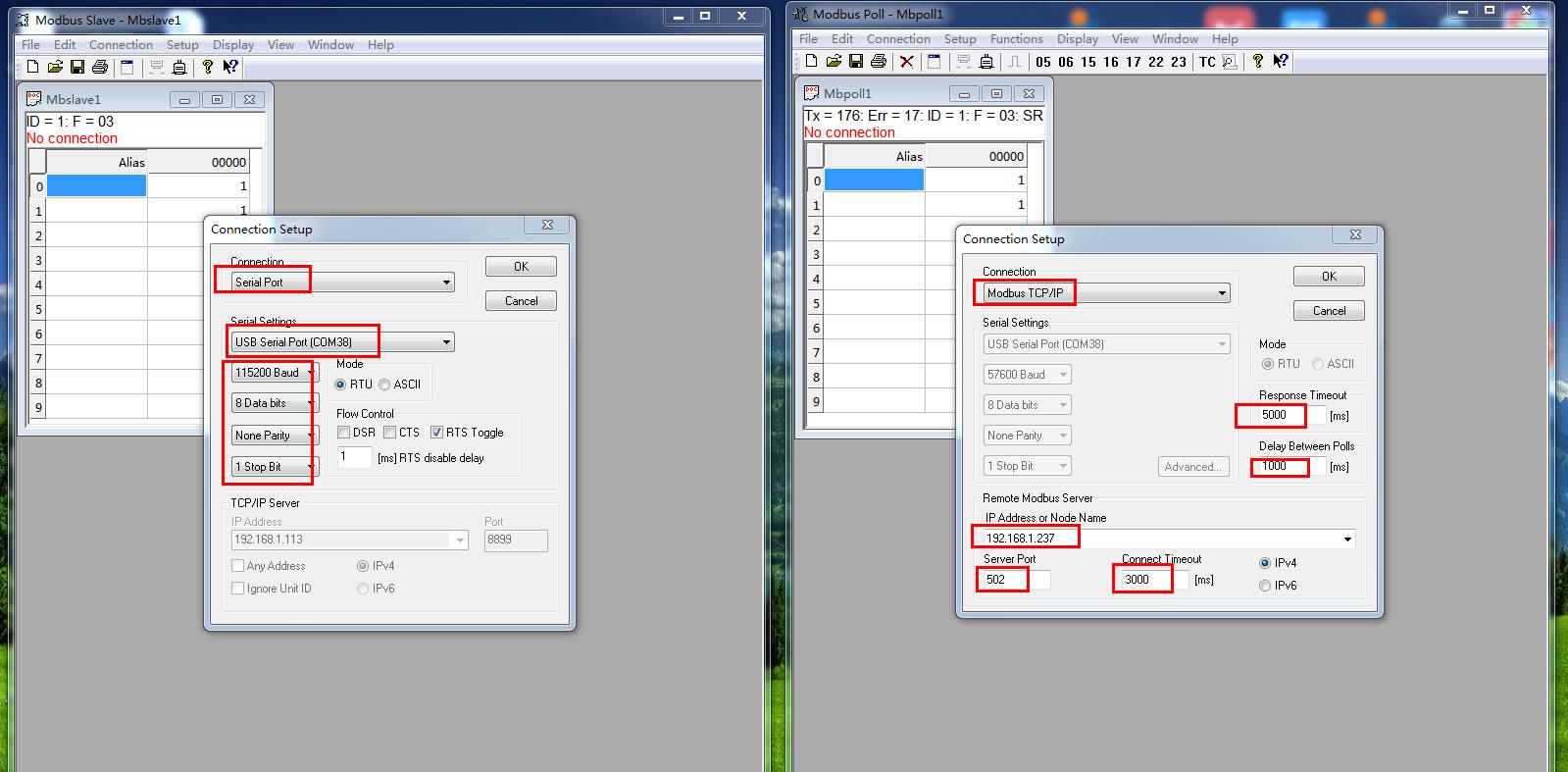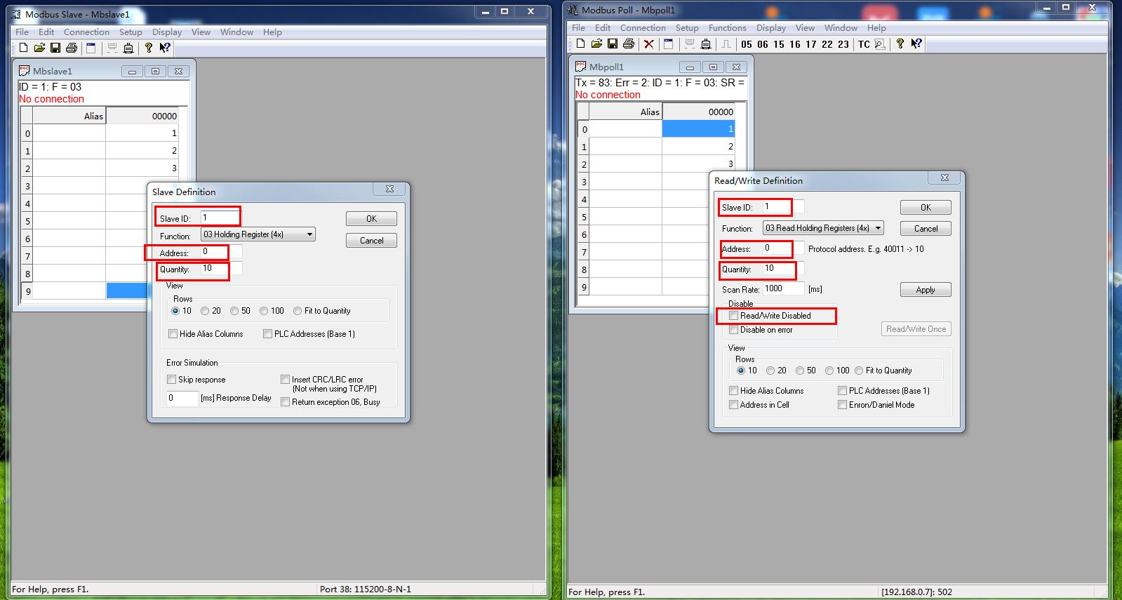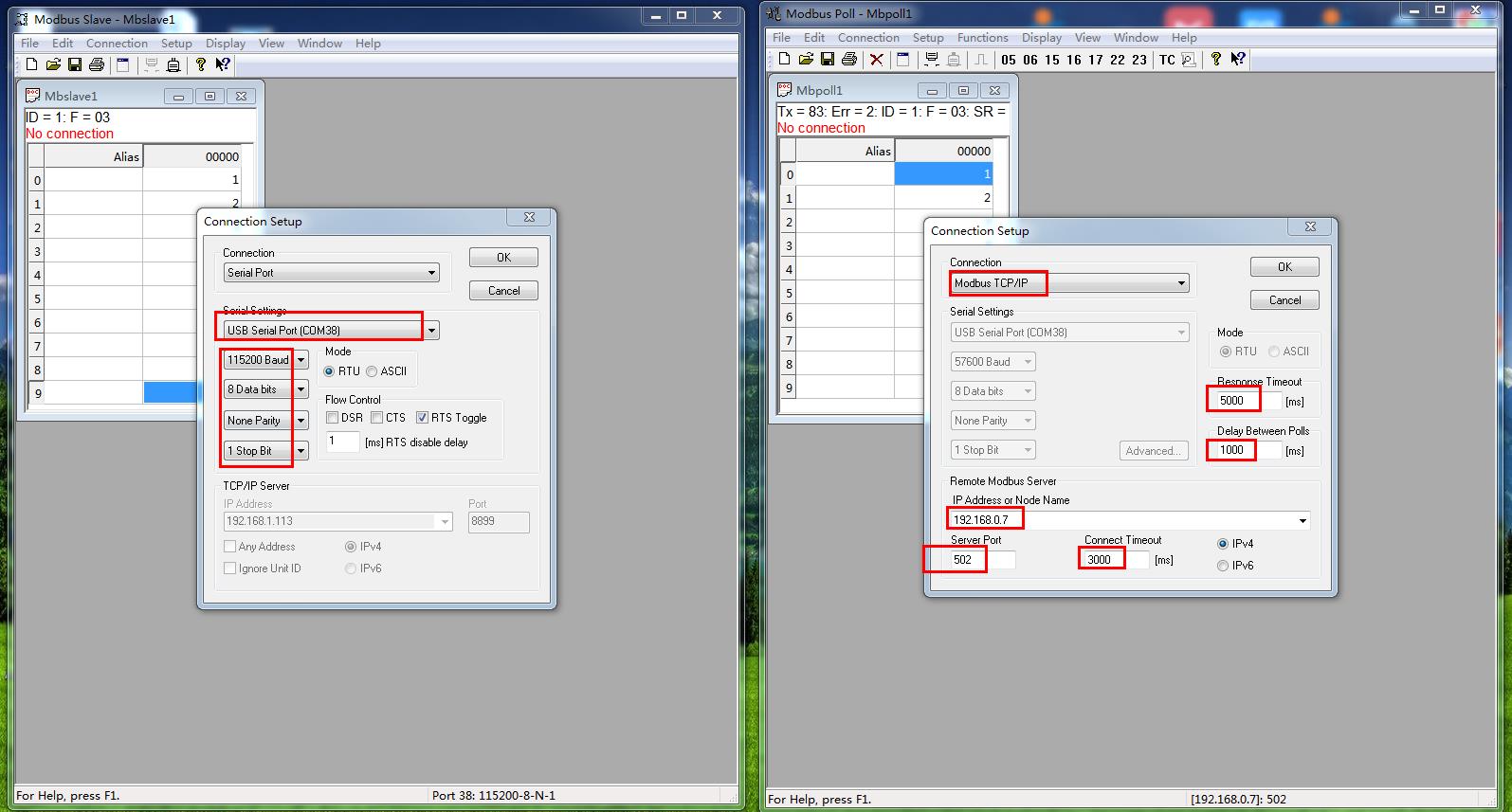 模擬測(cè)試用MODBUS SLAVE軟件做串口設(shè)備,用MODBUS POLL軟件做網(wǎng)絡(luò)端。