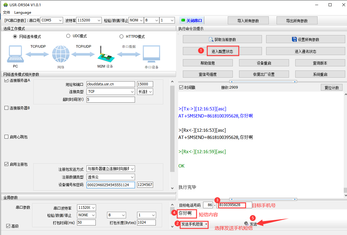 1. 點擊進入配置狀態(tài),然后發(fā)送AT+SMSEND=86181xxxxxxxx,短信內容