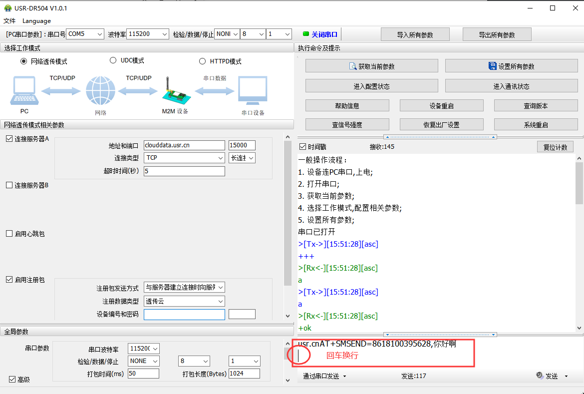 3、如果不想進入配置狀態(tài)直接發(fā)送短信的話,可以用密碼+AT指令的格式實現(xiàn),AT指令最后也是要加回車換行的