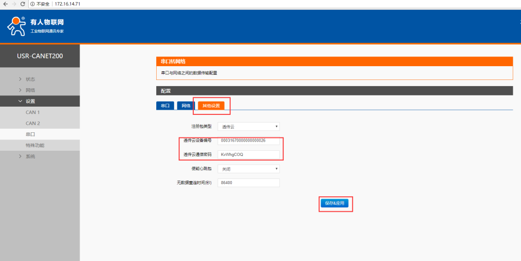 在其他設(shè)置中勾選透傳云,設(shè)備編號與通訊密碼進(jìn)入有人云設(shè)備列表查看按鈕中查看設(shè)備SN與通訊密碼,填寫至內(nèi)置網(wǎng)頁。