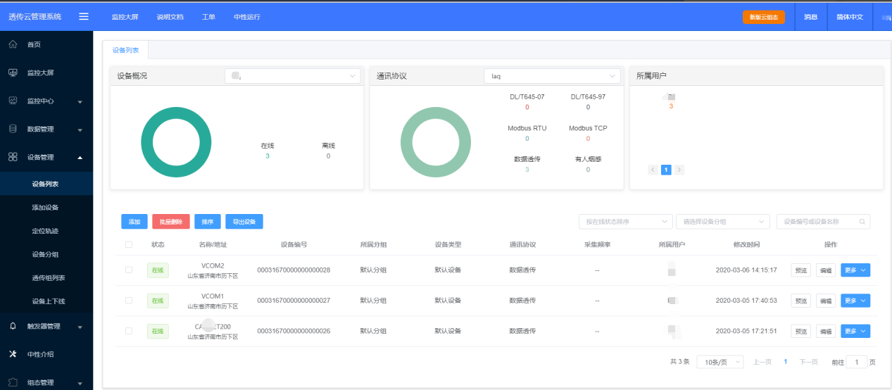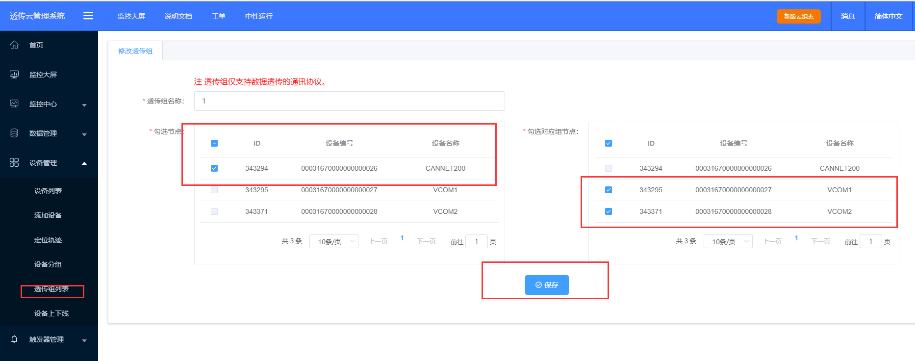 9. 當(dāng)三個設(shè)備上線之后,進(jìn)入設(shè)備管理——透傳組列表,建立透傳組。