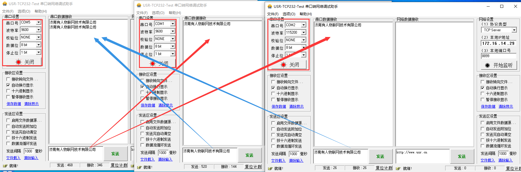 10.完成透傳組建立后,打開三個串口調(diào)試助手,兩個調(diào)試助手串口端連接虛擬串口,一個調(diào)試助手串口端連接CANNET200,使三串口參數(shù)相同,即可實現(xiàn)一對多的透傳測試。