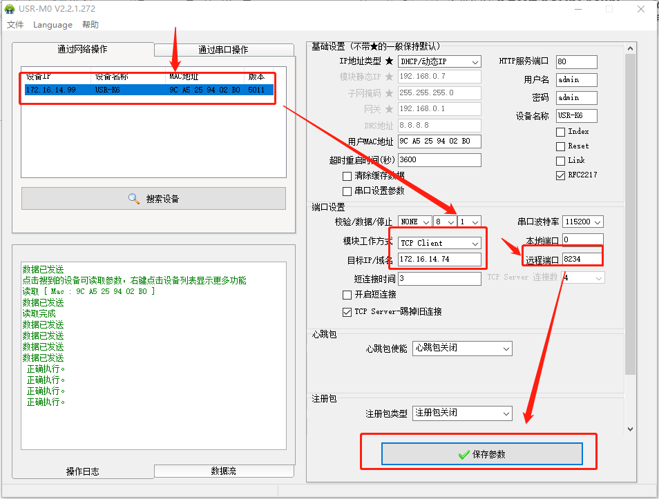 點擊“搜索設(shè)備”,當(dāng)搜索列表中出現(xiàn)K6的設(shè)備后,單擊搜索到的設(shè)備,設(shè)置配置信息并保存(動態(tài)IP),工作方式選擇TCP Client,目標ip為虛擬串口IP:172.16.14.74,遠程端口為虛擬串口的本地端口號:8234