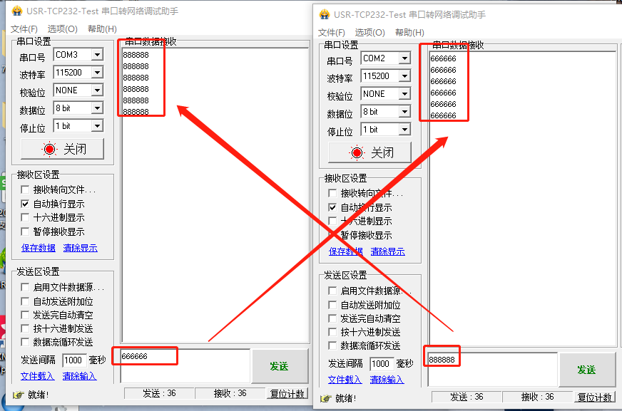 同時打開兩個串口轉(zhuǎn)網(wǎng)絡(luò)助手軟件。一個選擇虛擬串口,一個選擇COM3,即可進行收發(fā)測試