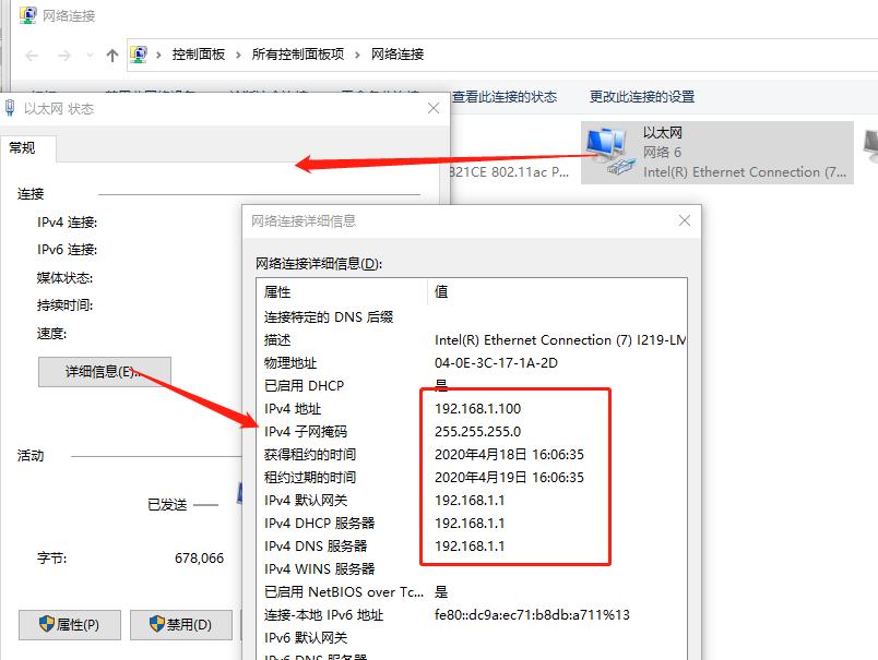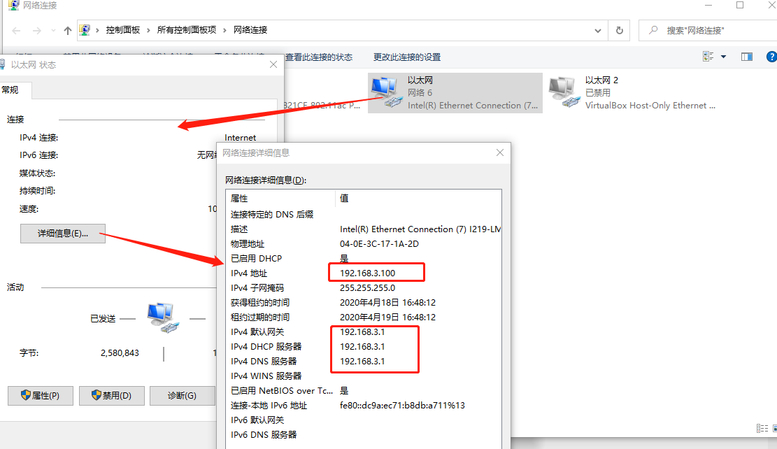 2) 雙擊該網卡,顯示詳細信息,查看電腦獲取的IP