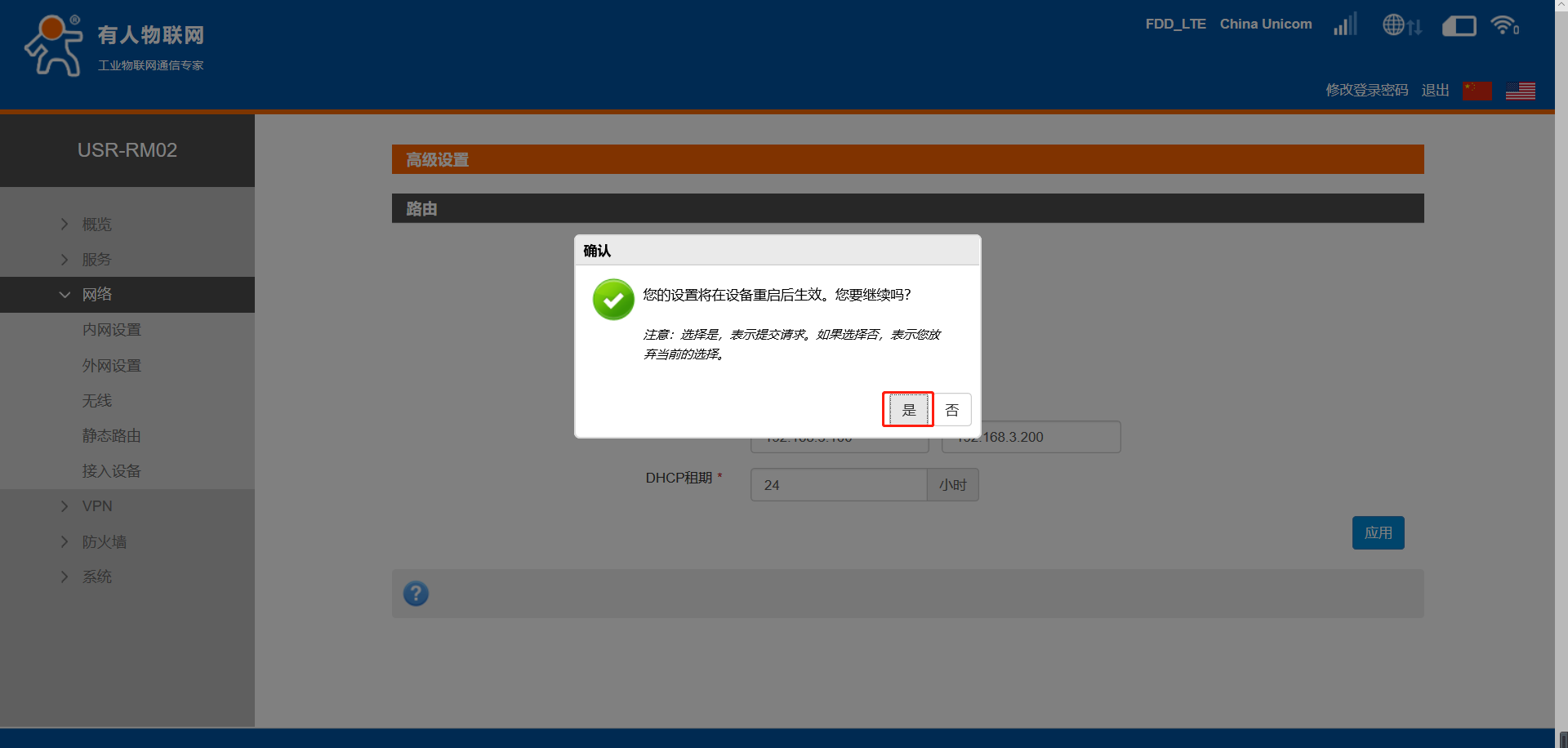 1、進入網絡--內網設置,進入修改界面,出廠默認,RM02的LAN口IP為192.168.1.1