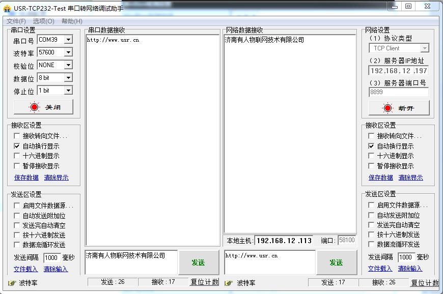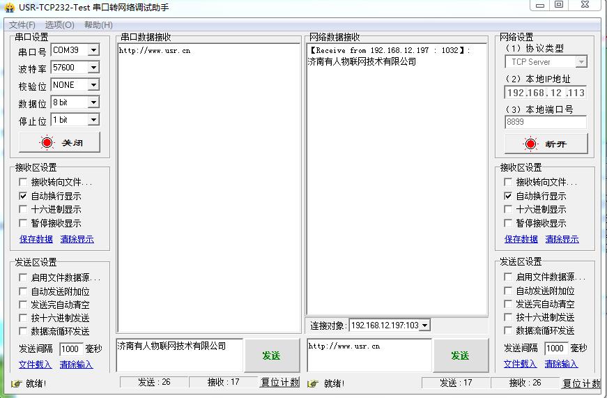 在電腦上用USR-TCp232-TEST軟件測試,打開COM口,網(wǎng)絡(luò)端設(shè)置參數(shù)。