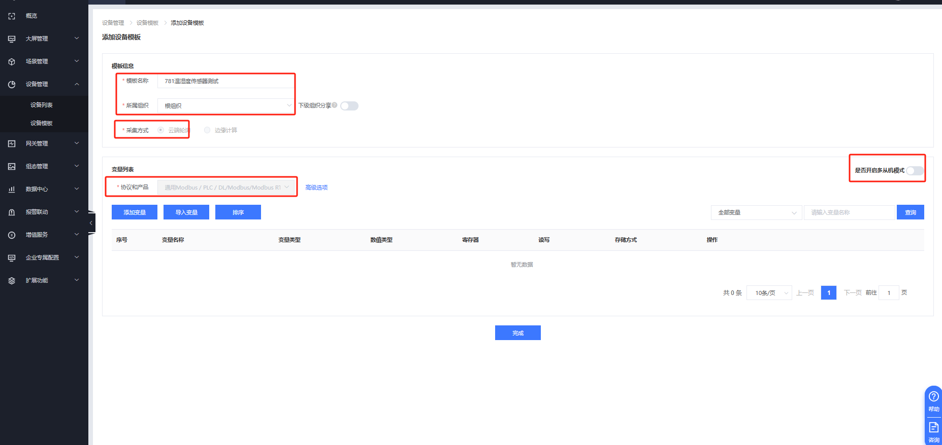 填入名稱,選擇根組織,選擇云端輪詢模板,協(xié)議選擇modbus rtu(若鏈接多個485從機設(shè)備可開啟多從機模式,案例中只有一臺溫濕度傳感器故沒有開啟多從機)