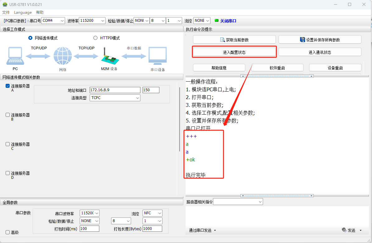 點擊進(jìn)入配置狀態(tài),發(fā)送+++a,設(shè)備回復(fù)OK