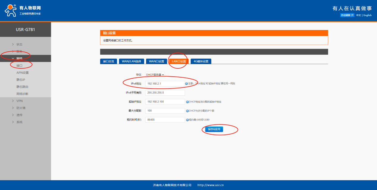 G781:網(wǎng)絡(luò)--接口--LAN口設(shè)置--IPV4地址--保存&應(yīng)用