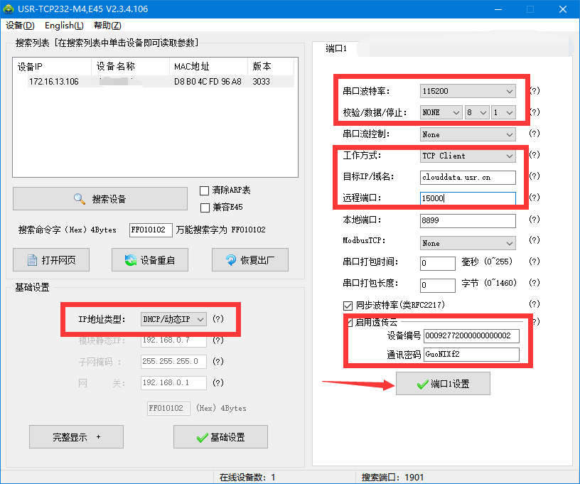 4.設(shè)置參數(shù):將工作方式 ,遠程服務(wù)器地址和遠程端口分別設(shè)置為:TCp client、clouddata.usr.cn、15000;