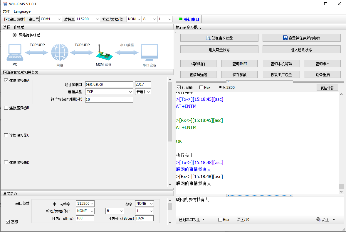 注:點(diǎn)擊進(jìn)入配置狀態(tài),如果模塊能返回+ok的字符,說明電腦和模塊連接是沒有問題的