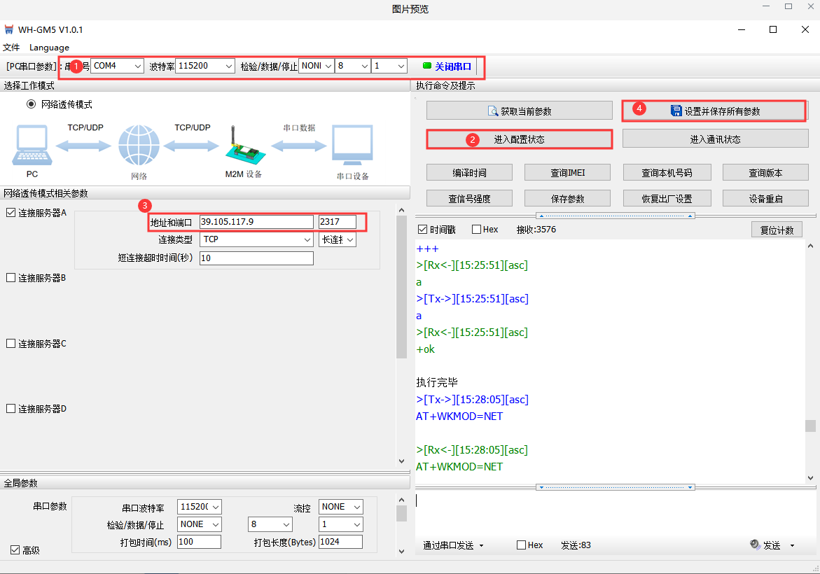 (2)打開串口——進入配置狀態(tài)——設(shè)置相關(guān)參數(shù)——設(shè)置并保存所有參數(shù)
